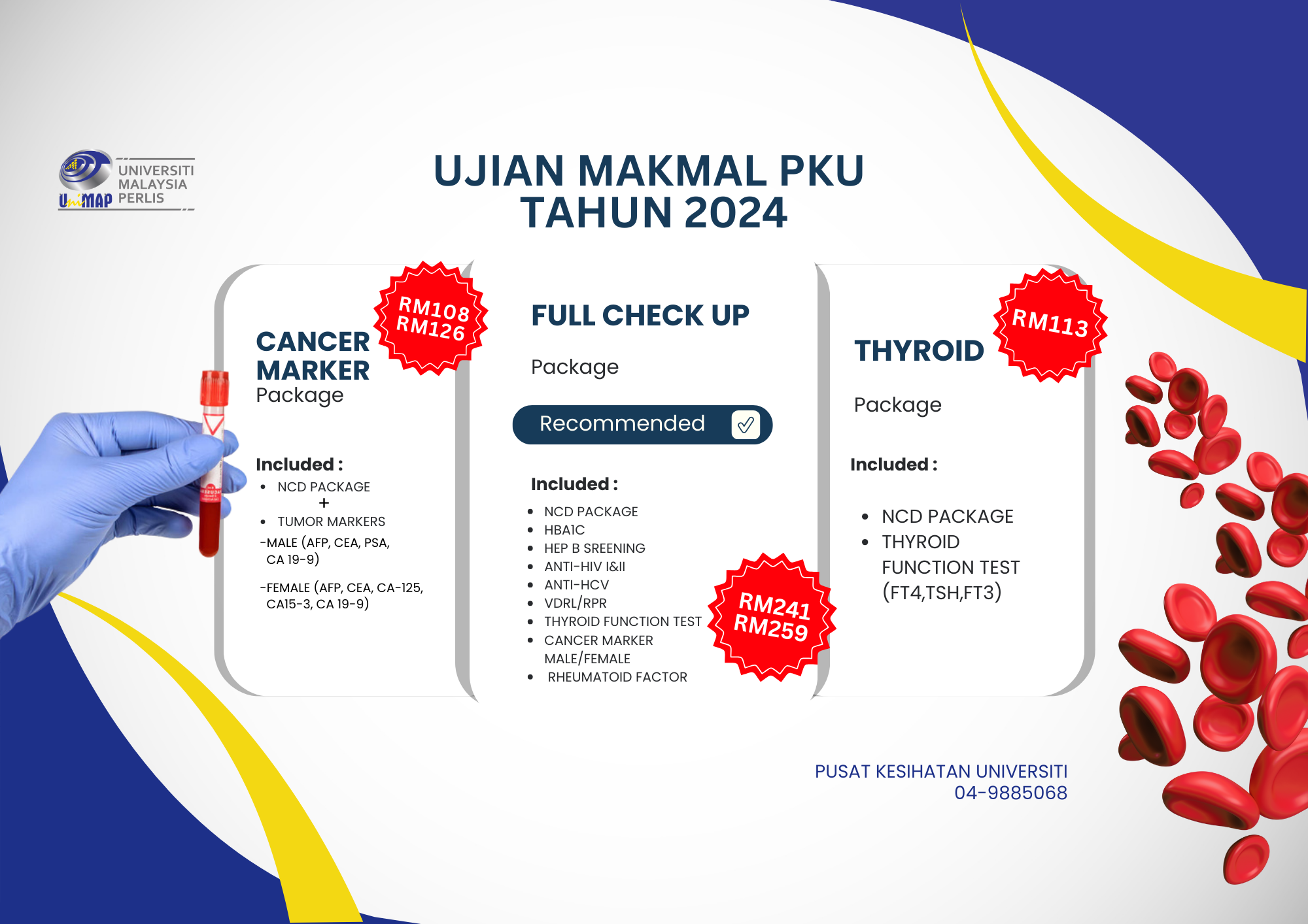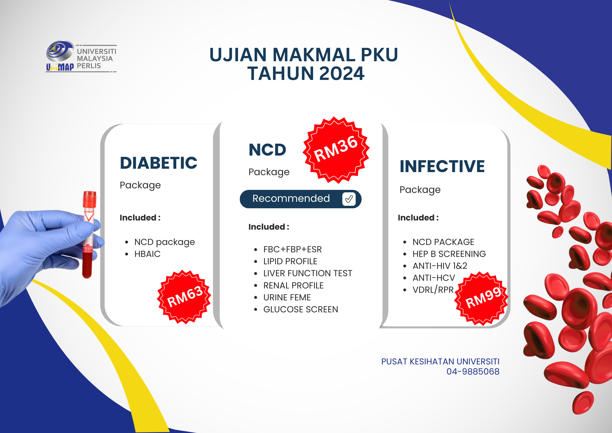 We have various health screening packages which you can choose. Each package is specially designed with your needs, requirements and budget in mind. Refer to the posters to find out more about our health screening packages.